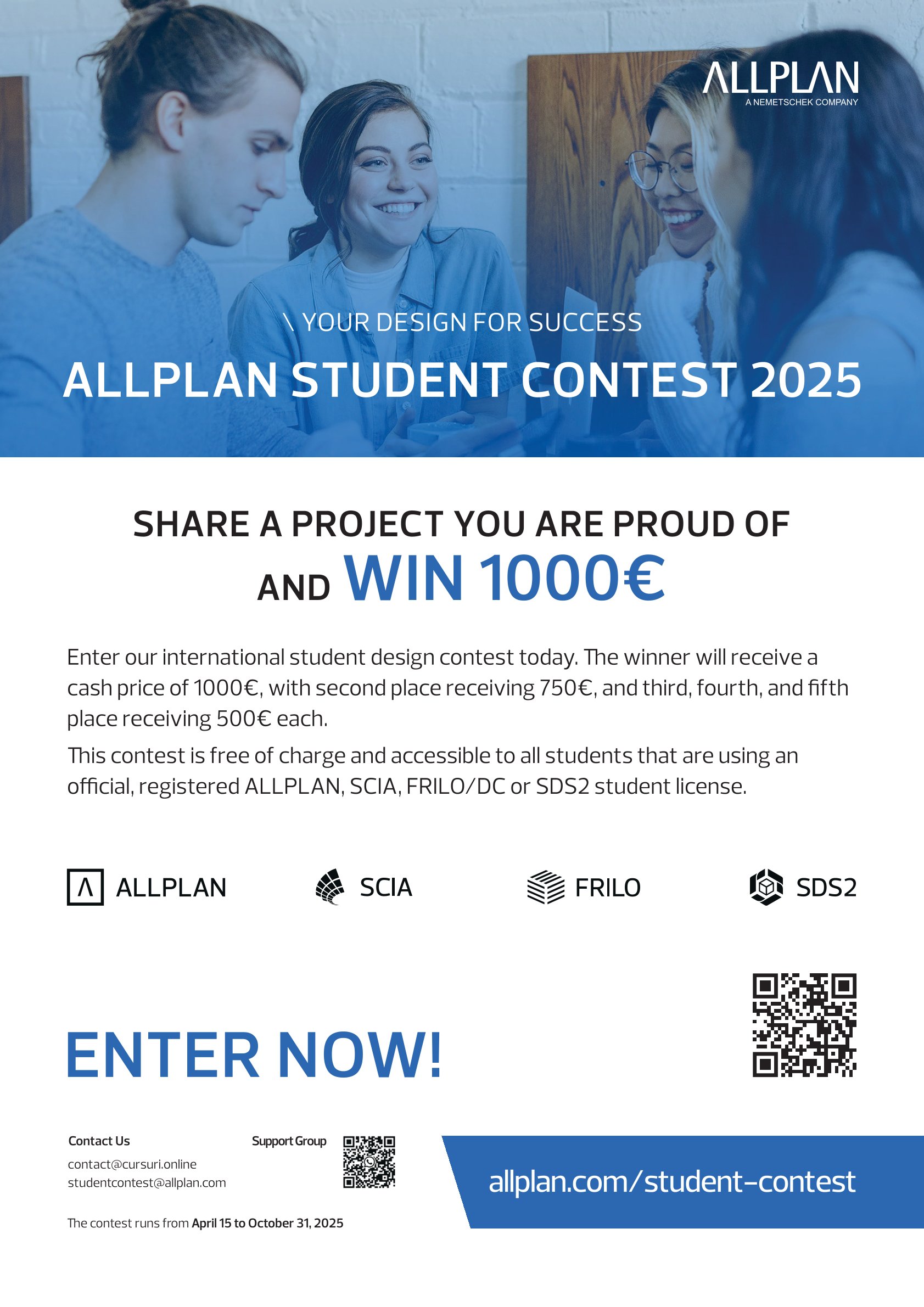 În perioada 15 aprilie – 31 octombrie 2025, studenții din România pot participa la ALLPLAN STUDENT CONTEST 2025, un concurs internațional unde au șansa de a câștiga premii în valoare de până la 1000 €, prin prezentarea unor proiecte realizate cu licențe oficiale de student ALLPLAN, SCIA, FRILO/DC sau SDS2.