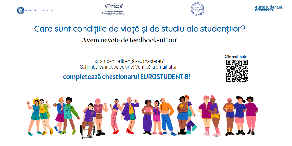 Dacă ești student la licență sau la masterat într-o universitate de stat sau privată, vei primi prin e-mail în această perioadă o invitație pentru a completa chestionarul EUROSTUDENT, pe care te rugăm să nu o ignori, fiind o oportunitate utilă să-ți faci vocea auzită și să oferi decidenților politici informații relevante cu privire la viața de student din România!