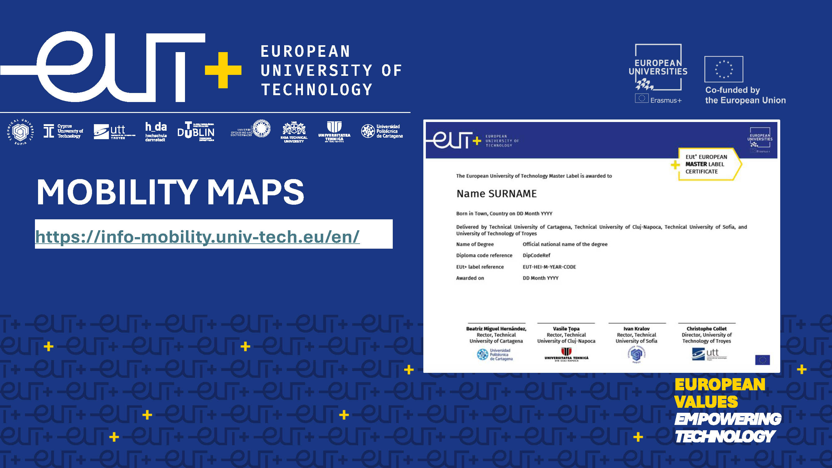 Studenții care vor opta pentru efectuarea mobilității Erasmus+ la una dintre universitățile partenere EUt+, vor primi o finanțare suplimentara de 200 euro/mobilitate. Studenții își pot alege universitatea și cursurile direct de pe platforma Mobility Map (https://info-mobility.univ-tech.eu/en/), care centralizează toate oportunitățile disponibile. Mai multe informații la https://constructii.utcluj.ro/studenti/student-eut.html