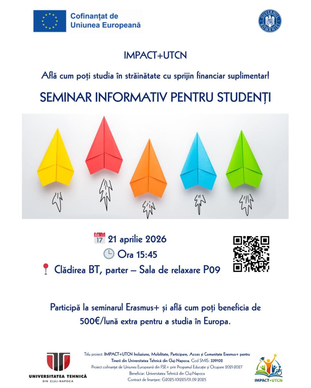 Dacă vrei să studiezi în străinătate și să beneficiezi de sprijin financiar suplimentar prin intermediul proiectului IMPACT+UTCN, te invităm marți, 21 aprilie, la o nouă sesiune informativă dedicată mobilităților Erasmus+.