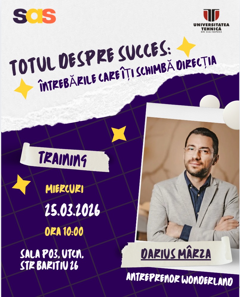 Societatea Studențească Antreprenorială din cadrul UTCN are plăcerea de a vă invita la un workshop special alături de Darius Mârza, antreprenorul din spatele Wonderland Resort.